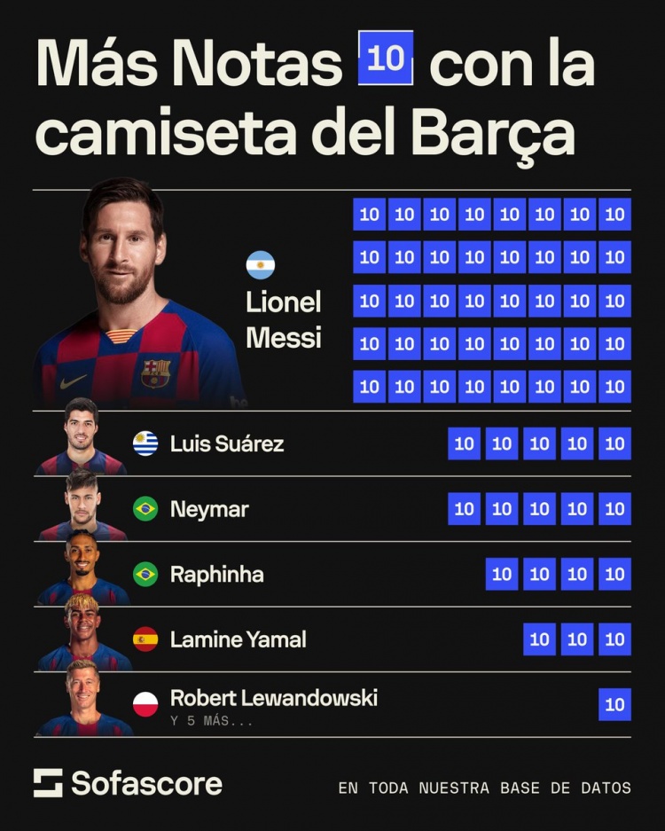 巴萨生涯获评10分场次:梅西40场,苏牙、内马尔5场,亚马尔3场